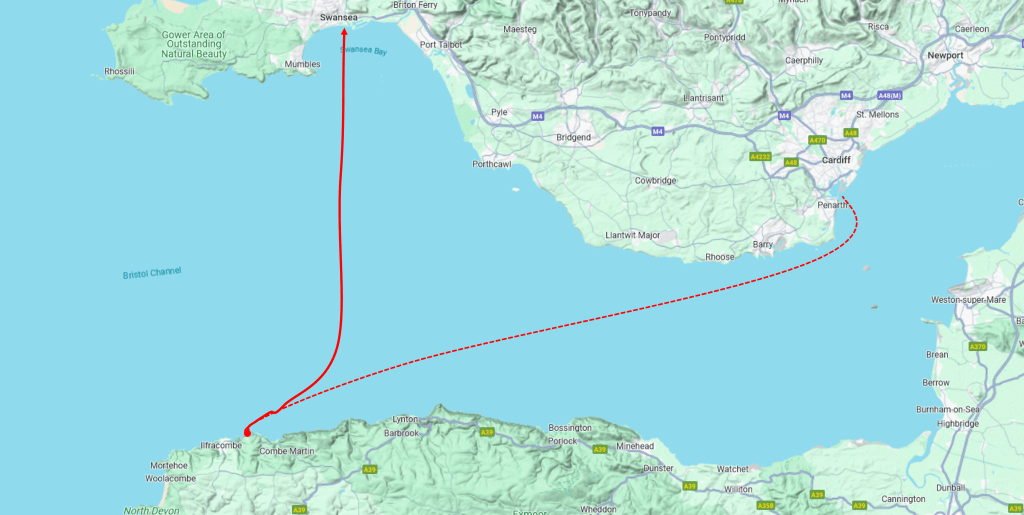 I headed for the only – and I mean only – safe haven for thirty miles either side. Swansea. Yes, Swansea in Wales. Quite a long way into Wales. It was either that or back into Watermouth Bloody Cove. On a broad reach at 8 knots I was there in time for elevenses, not that anyone offered me any, but the chap next door did take my lines and offer me his electriciy and agreed I’d made the right decision. “Most times you just can’t go up there, so we never try”, he said, sensibly.