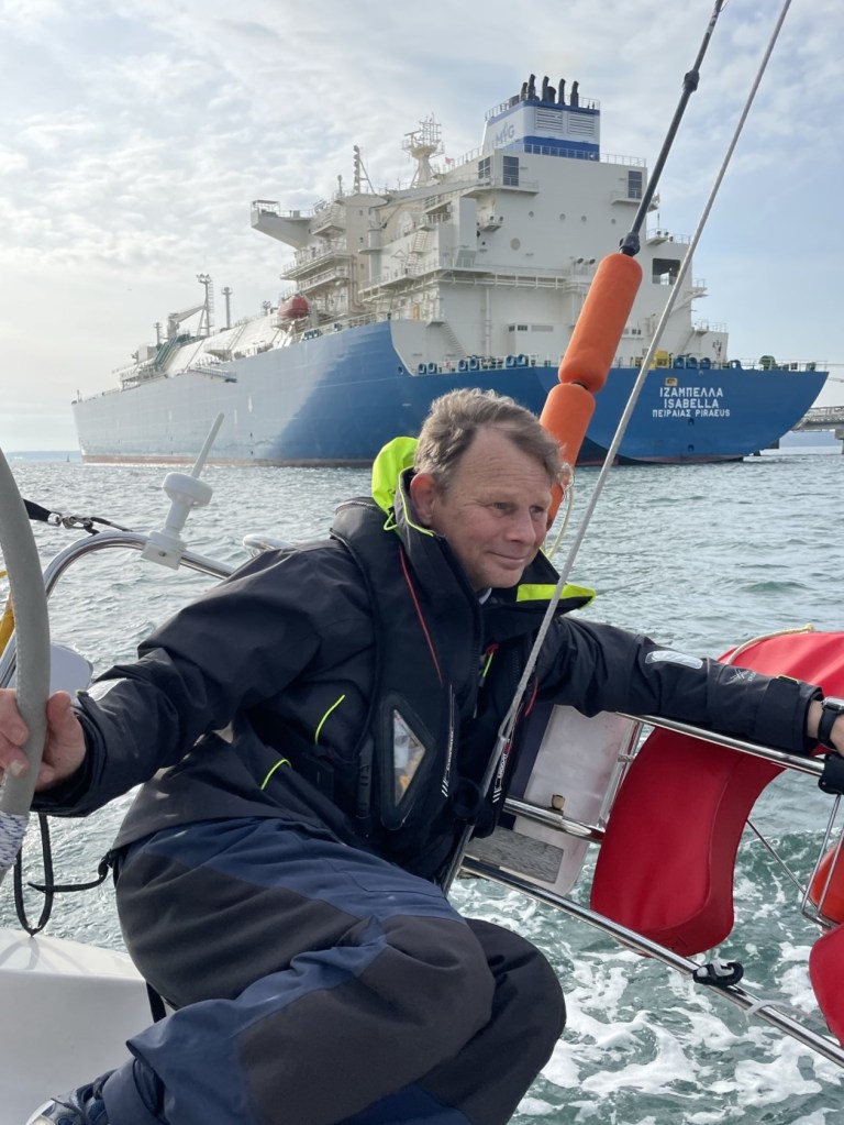 Having saved us from the rats, Penman settled down to his core skill: sailing as close as possible to Very Large Tankers. This was the one that didn’t make the Haven Pilot come and glare at us; I thought it best to put my phone away and try to look professional at that point.