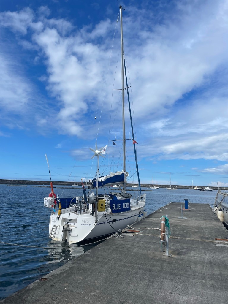 I’d known well in advance that Holyhead’s marina had been destroyed in a gale five years ago. I’d checked before coming and knew that they were still operating but all they had was what they called a landing stage, the one bit left of the old marina, and that there was a problem with planning permission to rebuild the pontoons. But the website looked smart and promised showers, toilets and a warm welcome.