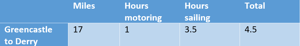 A scrub of the waterline and a lot of lazing about in the sunshine later and the tide turned, the sea breeze filled in and I sailed the 18 miles from the mouth of Lough Foyle to Derry city. I wasn’t sure if you were supposed to do this and I rather think most people don’t; I got a few odd stares and a thumbs up from a RIB as I sailed under the Foyle Bridge. Halfway up the Lough the radio had burst into life. A ship was calling the Port Control: “We’re ready to leave now,” he said, “but there’s a yacht coming up the channel. It seems to be called Blue Moon?” Luckily my friend in Greencastle had played his trump card. His friend in Port Control replied with a laconic ‘”Yes, that’s right.” Not reassured, the coaster called me next. “Blue Moon, I am coming down the channel. Red to red?” This is proper sea-speak for ‘shall we obey the rules of the road and each of us stick to the starboard side of the channel?’ I have never been asked this by a 150-foot coaster, and I have no idea what he was thinking of except that he had never seen a yacht before. The channel is indeed very narrow but well marked and Blue Moon is only three metres wide so with great skill and seamanship I managed to keep to my side of the channel as he passed. I gave him a cheery wave but he must have been gripping his wheel too hard to wave back.