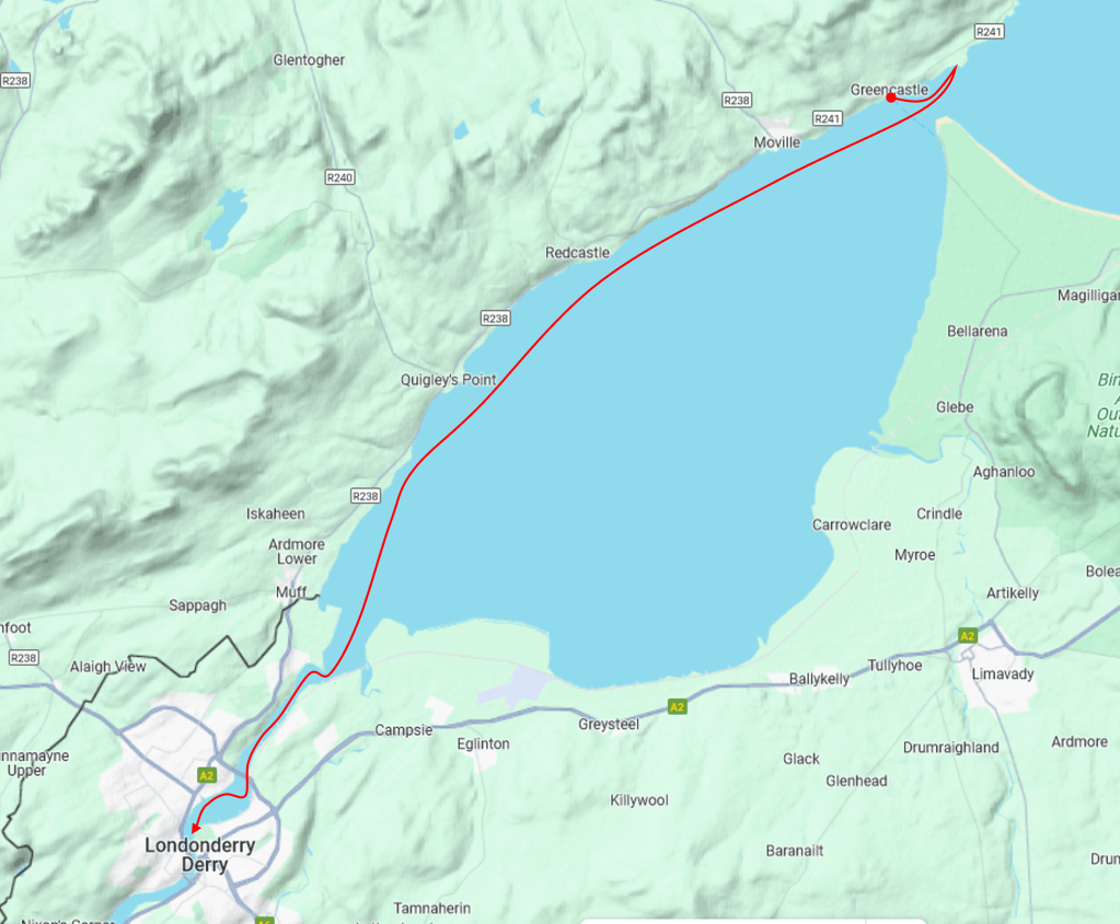 Getting here was entertaining. The crews of the five yachts inside me at Greencastle all arrived at once and asked me to move as they were going racing. No problem: they were very friendly and one of them worked in the Port and called his friend to check they were expecting me at the marina in Derry. When I said I had planned to go to a quiet bay and anchor they suggested one about ten minutes down-tide so off I went to a stunning little inlet I would never have considered, with rocks all around but two great beaches and the occasional golfer. Not a bad place to build my anchor-in-the-rocks-without-a-chart confidence, especially when I paddleboarded over to a particularly nasty looking patch that I was worried about swinging near to and discovered it was kelp.