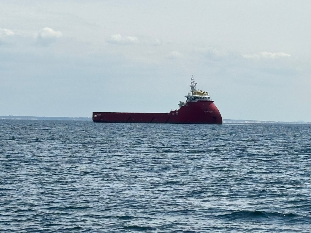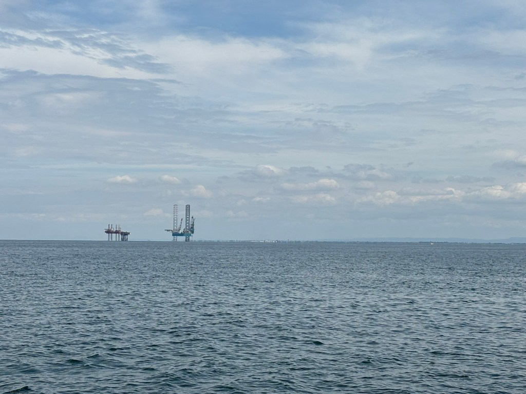 Finally the tide turned and I found myself whisked out past New Brighton and Crosby and Southport and – unlike everyone else heading off to Wales, Ireland, the Isle of Man at 35 knots, or the New World – I turned hard right and began what can only be described as the dullest day on the water. How foolish to think that it would be so much more exciting than looking at Dorset last year. At least there you have cliffs and tide races and ocean-girdling yachts to admire and dinosaur fossils to imagine and secret coves to pretend no-one else knows and military range safety boats to apologise to. The Lancashire coast is surprisingly flat and a long way off, which renders it largely invisible. What a relief then that they have pretended to discover oil here, and have built pretty convincing pretend oil rigs and something that is supposed to be a support ship but I reckon was rejected from a Bond movie set for looking too ridiculous, so I had something to look at for a bit.