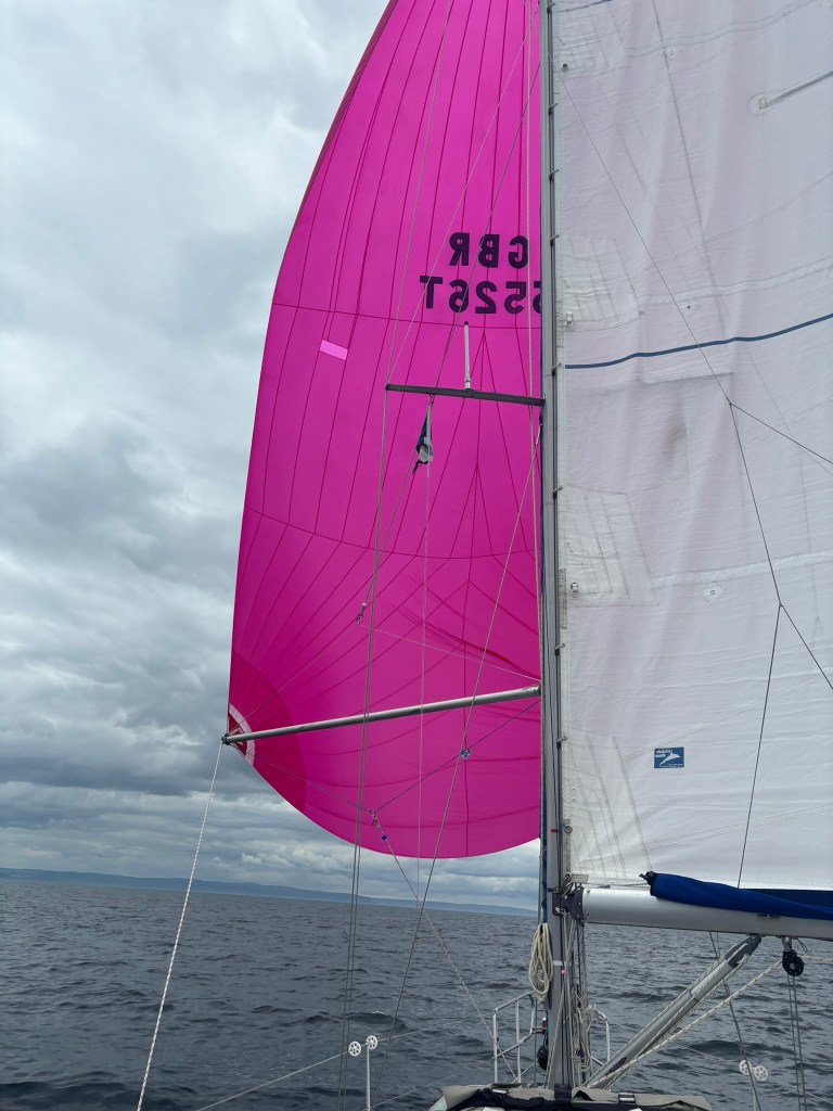 And so on to Ballycastle, which looked like it was going to involve eight hours slogging to windward in the rain, but amazingly it was the opposite. First the sun came out, then the wind went round so that I could first put up the assymetric spinnaker (keep up, the one that works closer to the wind) :