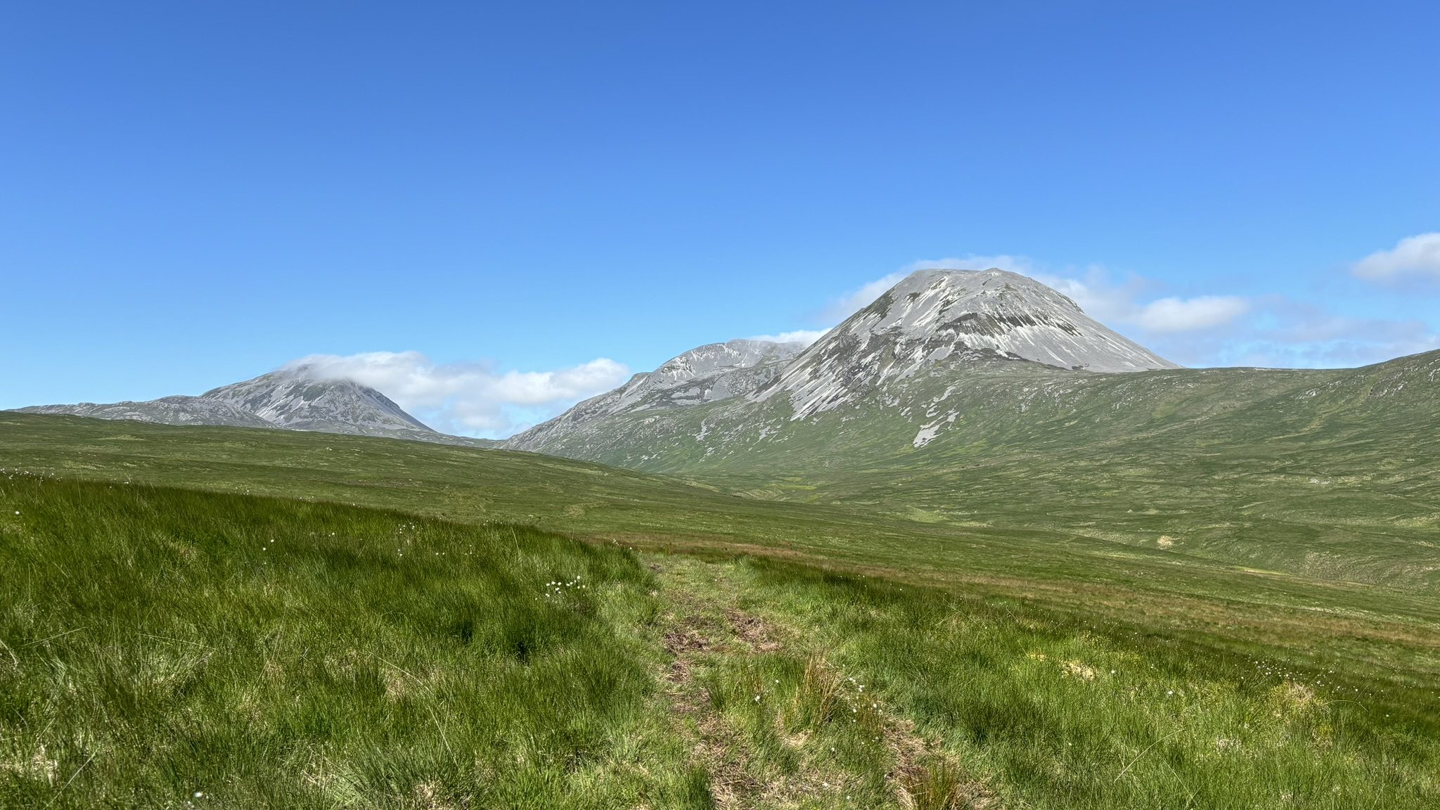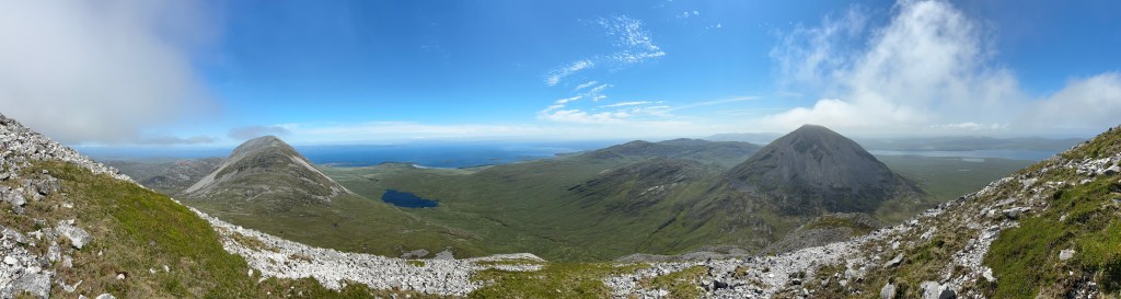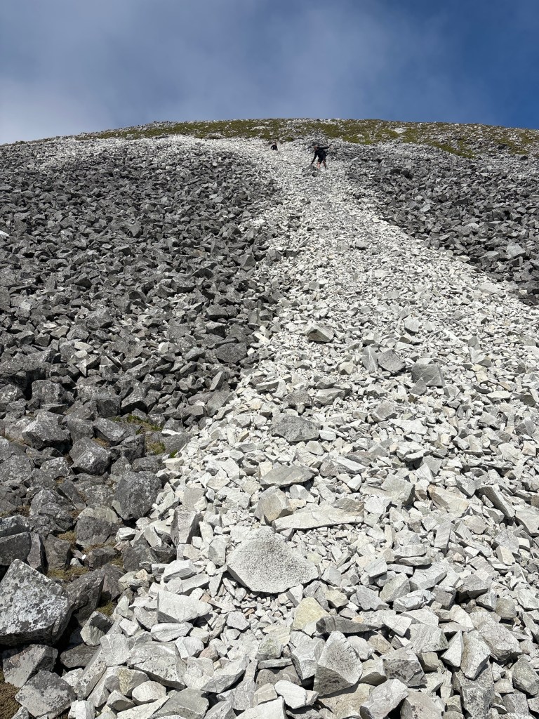 But the greatest challenge was the way the cloud began to thin as soon as we left the summit, tempting us with glimpses of far-off peaks on Arran, Islay, Colonsay, even Antrim on occasion. This made scree-surfing even more excited as it was almost impossible not to look at the views instead of the rocks ahead. Needless to say, as soon as we were back on relatively safe grass and rocks that were fixed to the rest of Scotland, the clouds pushed off completely, confirming that the only two hours that the views weren’t available from the summit were the two we were there. But what we did get was pretty decent.