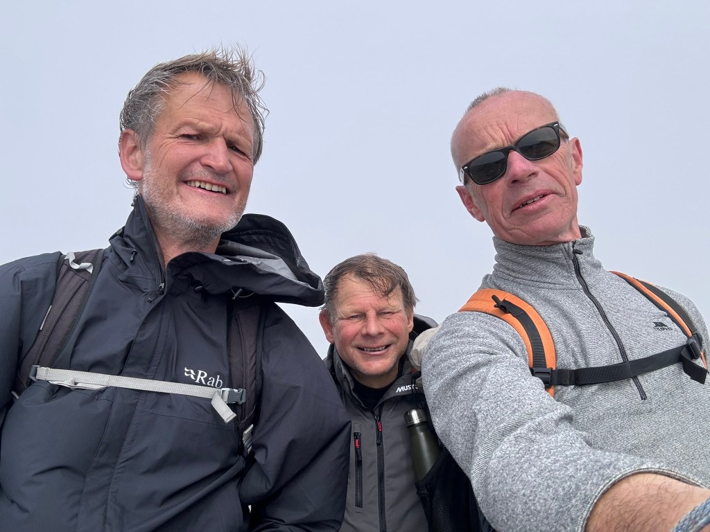 Rather optimistically, we decided to have lunch to give the clouds time to disappear. Yes, laugh if you will at the thought of three daft sailors hunkered down inside a ring of stones some helpful mountaineers had built around the trig point, presumably so that daft sailors could sit there out of the wind and eat their picnics. They had also installed a 4G mobile mast somewhere nearby (as is the case on most Scottish islands) so we could consult various weather apps promising a sunny, cloud-free day.