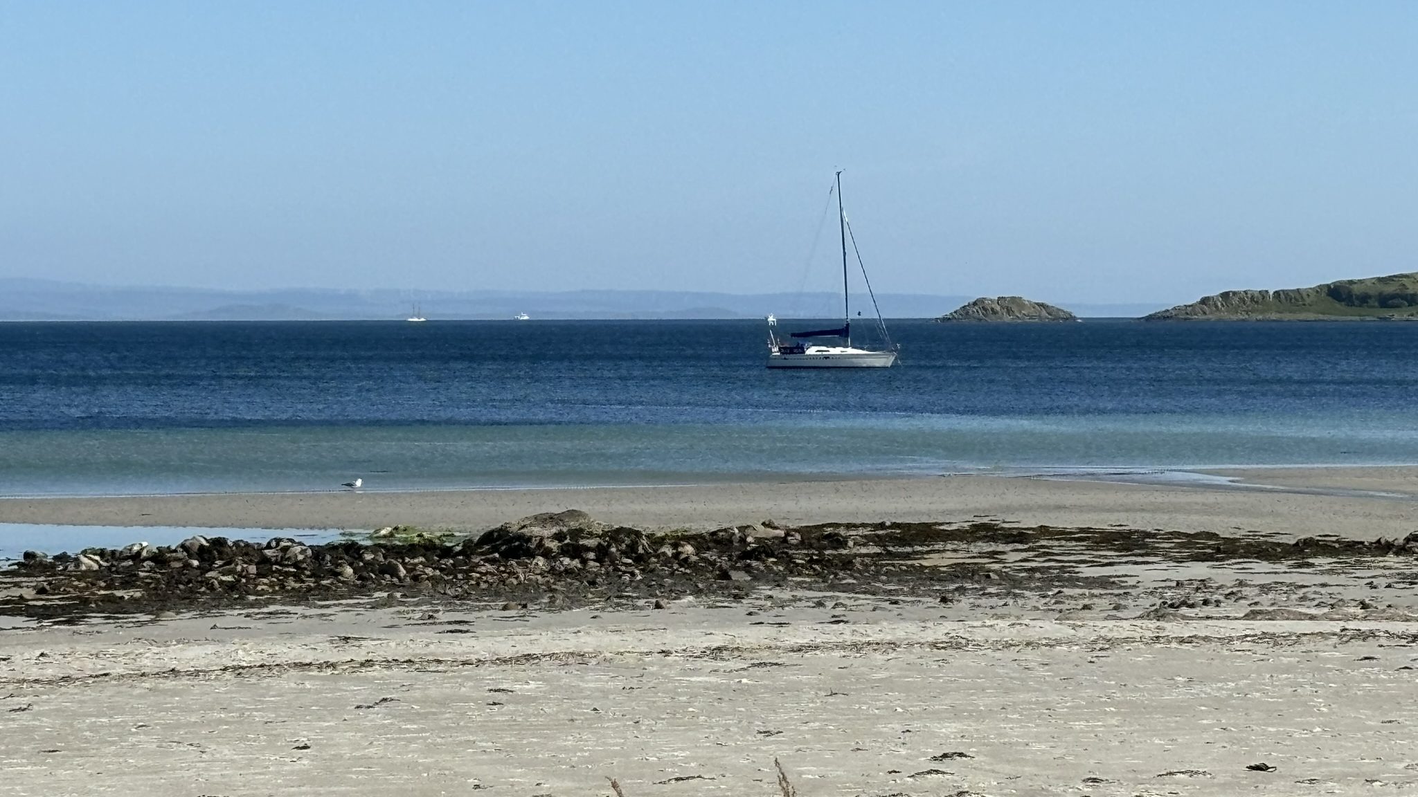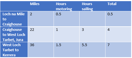 To start with, our route took us up the Sound of Islay between the two islands, which allowed us to contrats the barren Jura shore with Islay, where our remaining distilleries lined up in a row, along with the villages each one supports. This is where the wind did us its second favour: most sounds are opportunities for the wind to blow straight up and down, regardless of the general wind direction elsewhere. Faced with a vaguely north westerly wind and a definitely west of north Sound, we feared the worst, but to our astonishment the wind blew sideways enough to let us sail the whole way, helped by a massive tide. On and into the wilds of West Loch Tarbet, where we threaded our way through a couple of very narrow rocky passages to anchor in a bay with the only thing resembling a house on that side of the island, and then only a bothy for bonkers bog-walkers to sleep in. A quick visit confirmed there are quite a few of these as they wrote their names in the visitors’ book and later that evening there were lights in the windows. Unless, of course…