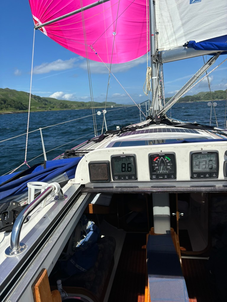 Luckily the wind, and the weather in general, had one last favour to offer us. As we motored out of West Loch Tarbet the sun came out, the wind gradually swung round and as we bore away past the Corryvreckan and Grey Dogs and through The Great Race (yes, all these places are real and mainly rather scary), for the only time this week the wind was with us, so we wasted no time putting up one spinnaker and then the other, with the result that we ended up in Kerrera Marina opposite Oban in plenty of time to bag a pontoon, with the satisfaction of our last sailing day in sparkling sunshine doing nearly nine knots with the spinnaker up in 18 knots of breeze.