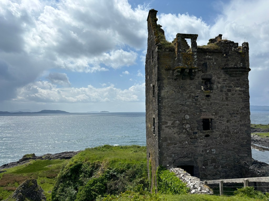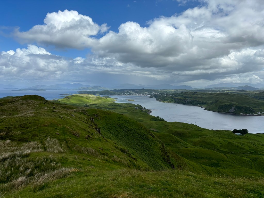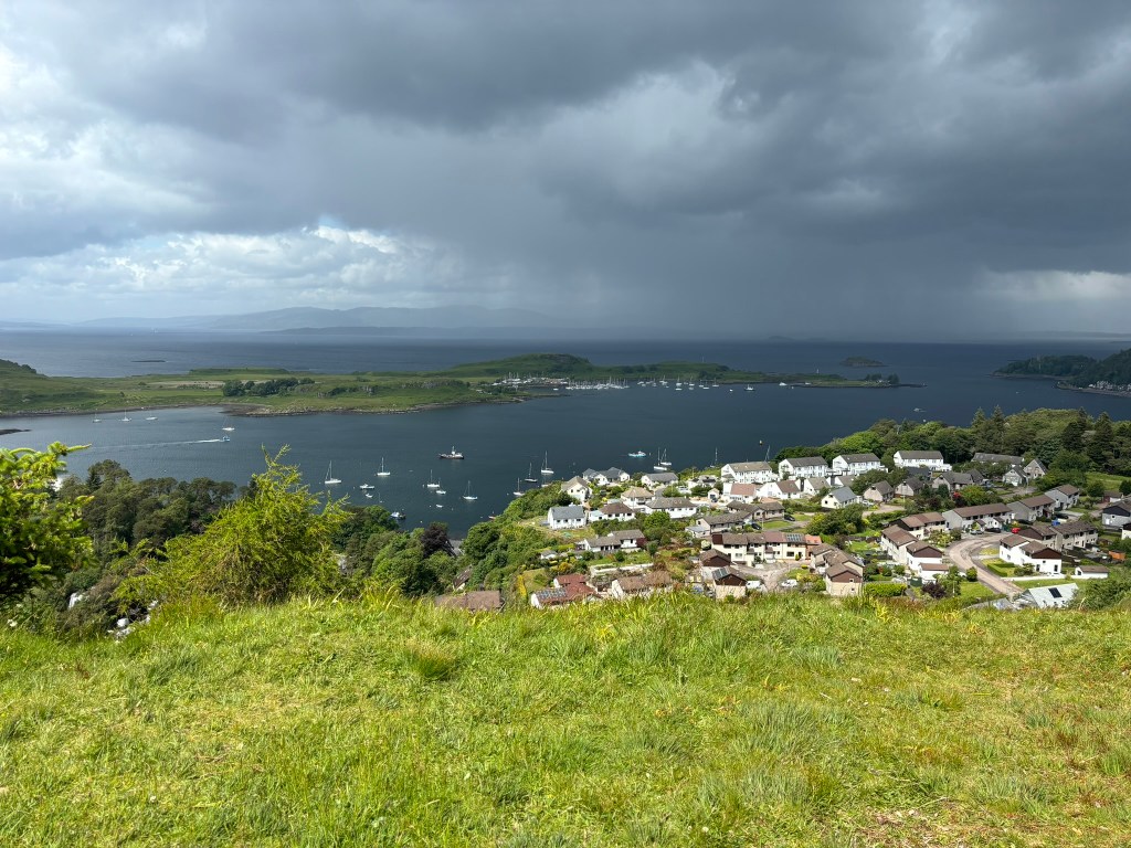 That was it as far as sailing is concerned, but a high note to go out on. The wind went into the high 20s and stayed there, the temperature dropped to 5 degrees and there was snow on Colonsay next door. In June. So we stayed tied onto a nice solid pontoon for two more days, donned our walking boots and hit the hills of Kerrera and Oban. Which, luckily, are rather nicer than we expected as they have amazing views…