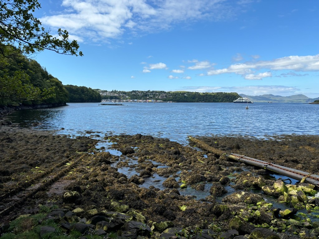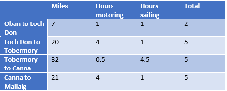 Back to Oban, or more precisely Kerrera where I had left the boat. I had had the clever wheeze of catching a plane to Glasgow and then a bus from the airport which cost exactly the same as the train but got me to Oban five hours earlier, even having sat in a traffic jam for a full hour outside Dumbarton. So the boat was fuelled, watered, provisioned and raring to go the next day when Peter arrived, but then had to wait patiently for an hour while I finished a meeting. Even though this meant it was 5pm I was so keen to get some sailing in that we forewent the gastronomic opportunities of Oban and set off immediately to sail an hour and a half over to Loch Don on the Isle of Mull.