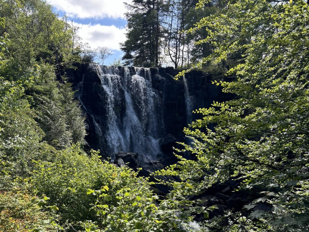 However, Plan B looked to be in jeopardy too as the forecast steadily worsened, and started muttering about Force 7. For once we had played the Tobermory-in-a-blow card correctly: we had bagged a pontoon by lunchtime and donned our walking boots to head up for an excellent walk around an inland loch and the various waterfalls I had tried to anchor under a year ago; I couldn’t supress the schadenfreude when we returned to see the pontoons and moorings full and late-comers fighting for anchoring space in the bay.