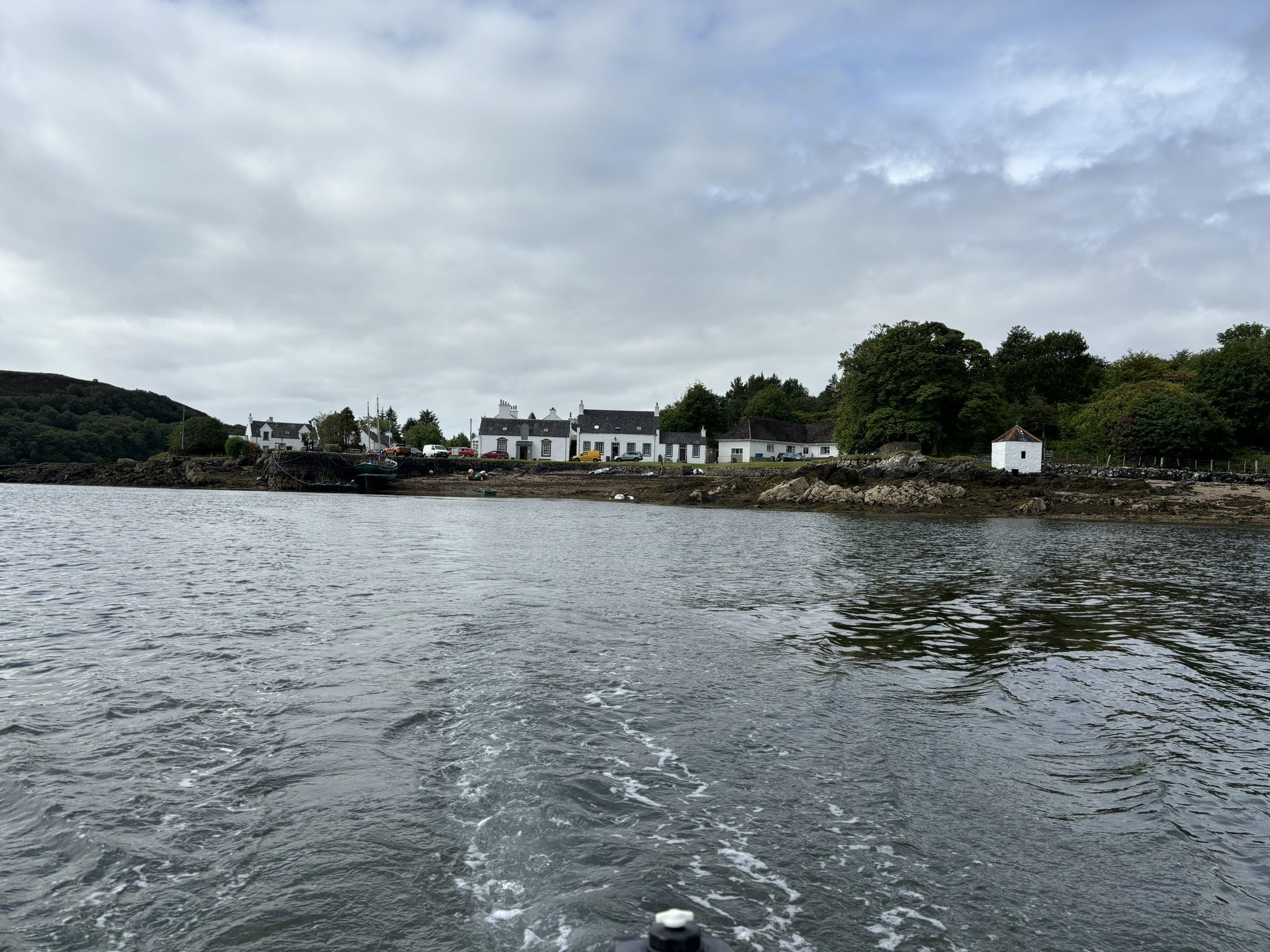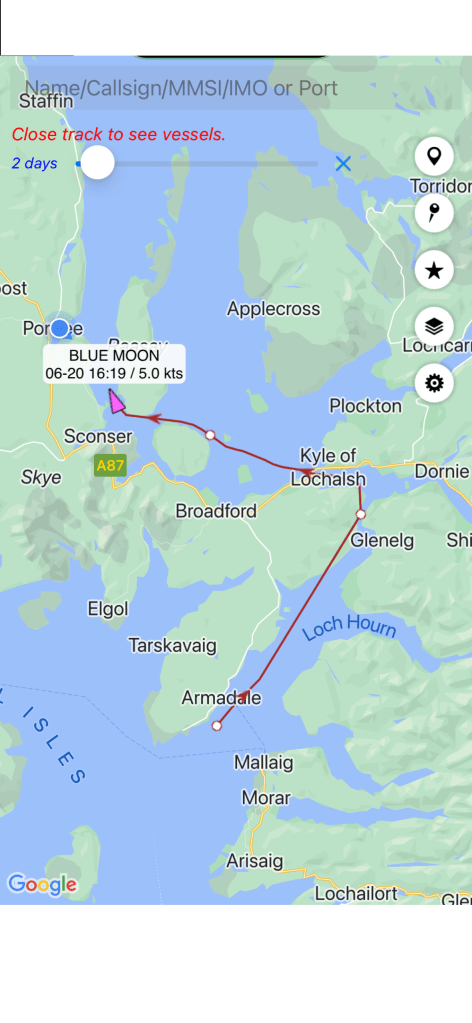 Never mind, on up through the Sound of Sleat past Glenelg and the little ferry that so entertained me last year. Ever-entertaining, as I approached the narrows I heard the big fishing boat ahead call him up on the VHF wondering if the ferry was about to cross in front. “Oh no,” replied the ferryman, “you’re alright there. They’re just cleaning the pier so I’m sitting out here waiting.” This seemed a truly odd arrangement to me, but I suspect even more so to the cars queued up on the road leading down to the slip.