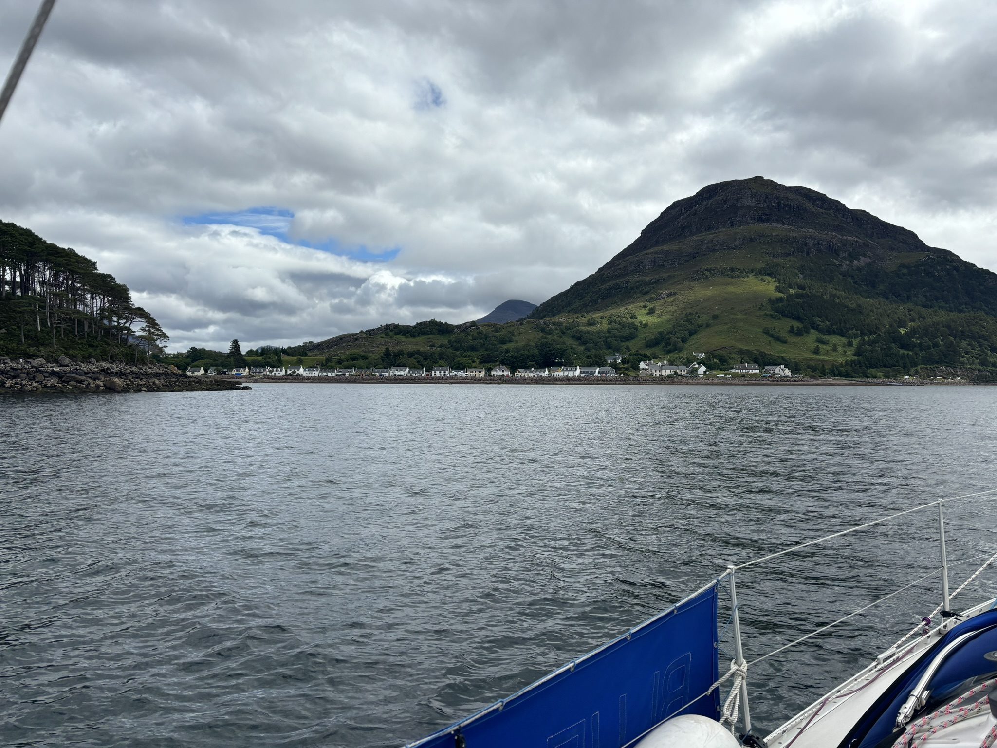 I quickly took in one reef and then another as we sailed up the loch and more and more gusts hurtled down at us – none quite as bad as the first but all in the high 20s. This spoiled the afternoon considerably as Loch Torridon is a very big loch and it took quite a while to get to Shieldaig. I was pleased to find a free visitors’ mooring off the village, knowing I would sleep a lot better moored than anchored with gusts coming from every direction all night.