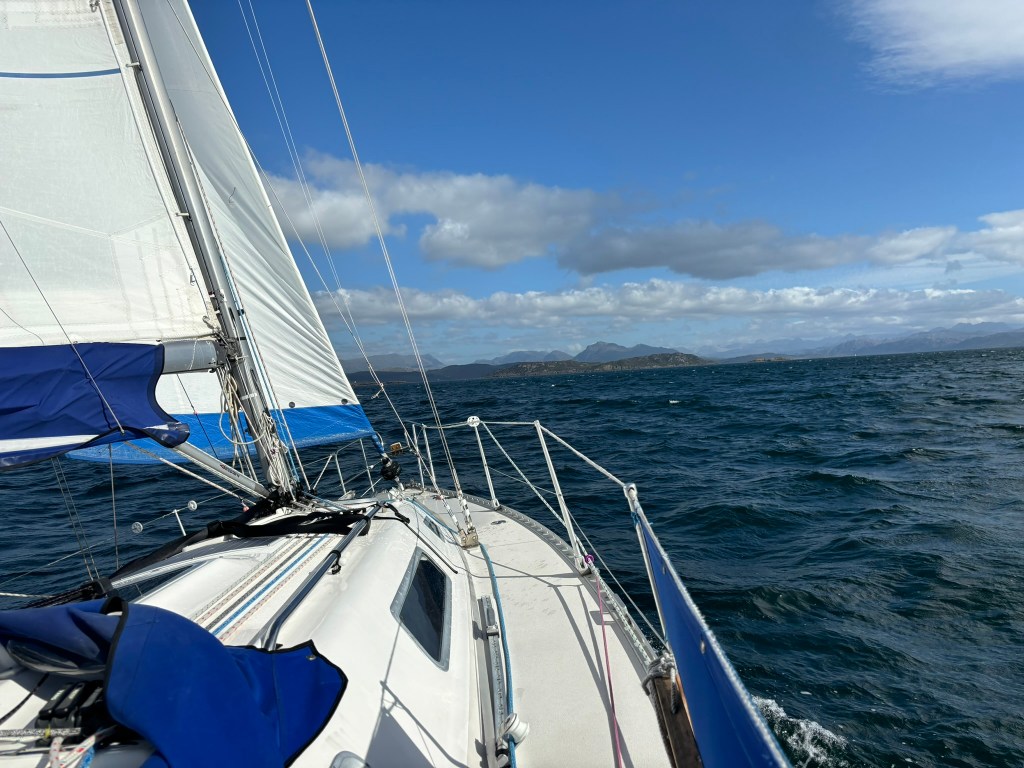 I felt a bit of a fool as we set out of the loch: it was blowing 12 knots and we were going very slowly. I kept looking behind for more wind but no sign, then out of nowhere it picked up and in under a minute had gone from 12 knots to 31. This time it wasn’t a gust, I was out at sea and surfing down waves in a steady Force 7. Worse still it was a dead run – non-sailors: big wind right behind you is quite dangerous, it could get behind the mainsail and fling it and the boom across the cockpit taking you with it if you’re not careful. I grabbed the wheel off Raymond and steered very carefully until it had eased a bit, then did the prudent thing and took the mainsail down completely, thinking I would carry on like a proper cruiser with just the genoa, just in case.