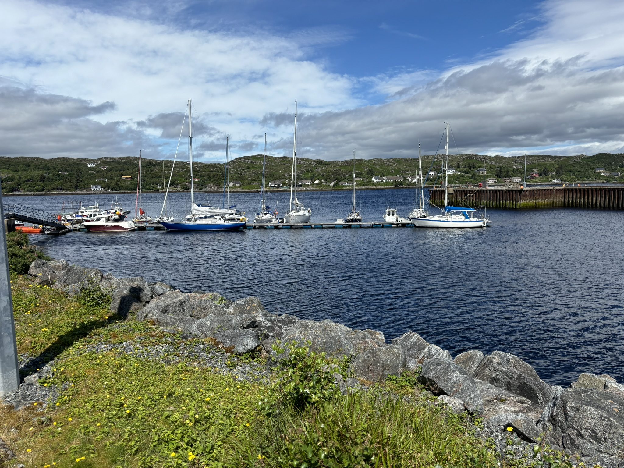 This worked fine for a while, wind steadily 25 knots plus but with no mainsail it was easy going and we were doing 5-6 knots. An hour later, and the wind began to drop. 20 knots, then 15, and we slowed down a lot. Never mind, I had all day. 8 knots, 6. We stopped. Only one thing for it: back up with the mainsail, and no reefs this time, not in 6 knots downwind: even with the full main I had to put the engine on to keep us going through the waves left by the near-gale. So quiet I made a bacon roll. Fatal mistake: just as we got to the point where we’d turn right into the bay with Lochinver at the head, guess what? 30 knots again, this time with full sail and a bacon roll in one hand and a cup of coffee in the other. By now my reefing was quicker than a Ferrrari pitstop, and we flew into the bay with two reefs and a half-rolled genoa. Within minutes we were up the loch, past the rocks, sails down, fenders out and tied up on a very snug pontoon in a very busy fishing harbour, with the first yachts I had seen for a couple of days. All six of them, all apparently living there. I could see campervans but they were on the other side of the harbour at least.