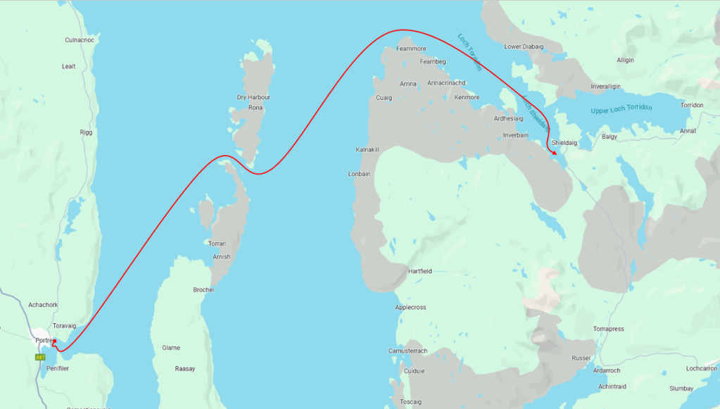 Loch Torridon was my first port of call, but I use the word ‘port’ advisedly: it is famously empty and only has two tiny villages: one called Torridon, which seems fair enough, and the other called Shieldaig, which is a bit confusing as the next loch up also has a village called Shieldaig, and I kept reading the wrong page in the pilot book and getting confused. I was particularly and irrationally nervous about Loch Torridon – the word Torridon has always felt very dark and foreboding, perhaps because of my night on the mountain which is part of the Torridon range and I remember the word on the map, and perhaps also because it just looks very bleak and rather lonely. Shieldaig suggested a less torrid time, so that’s where I headed.