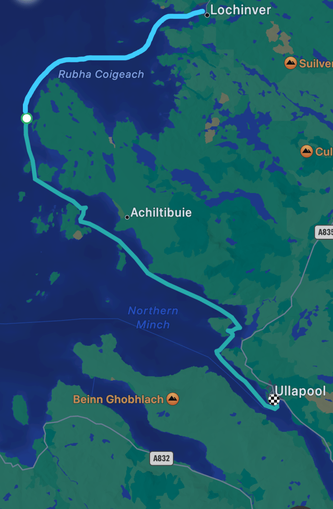 Lochinver was as friendly and secure as I remembered, the toilets all had working seats, and I was detained by a man with an excitingly fast trimaran who had broken his windlass. I was delighted to give him the name of my preferred windlass spares provider, even more delighted when they found the part he needed, and made me feel – if only briefly – like a proper cruising yachtsman.