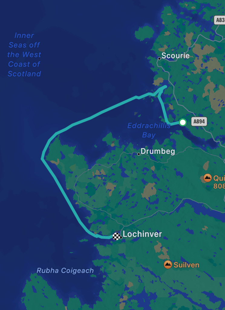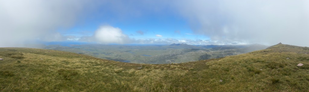 The summit turned out to be a broad, flat, grassy dome with nice rocks to sit on, so I opened my rather more meagre picnic and sat down to admire the view, which was of the inside of a cloud and some grass, some of which was as much as ten metres away. Of course, this being Scotland, there was 4G signal so I decided to wait half an hour reading The Guardian on my phone, just in case things improved a little. They didn’t, and I had read all the news, so I got up to leave, and then the miracle happened. I bent down to pick up my rucksack and when I stood up again the clouds had parted and the view had appeared: first out to the coast, where I could see all the lochs I had sailed past and into, starting with Kylescu and Badcall Bay…