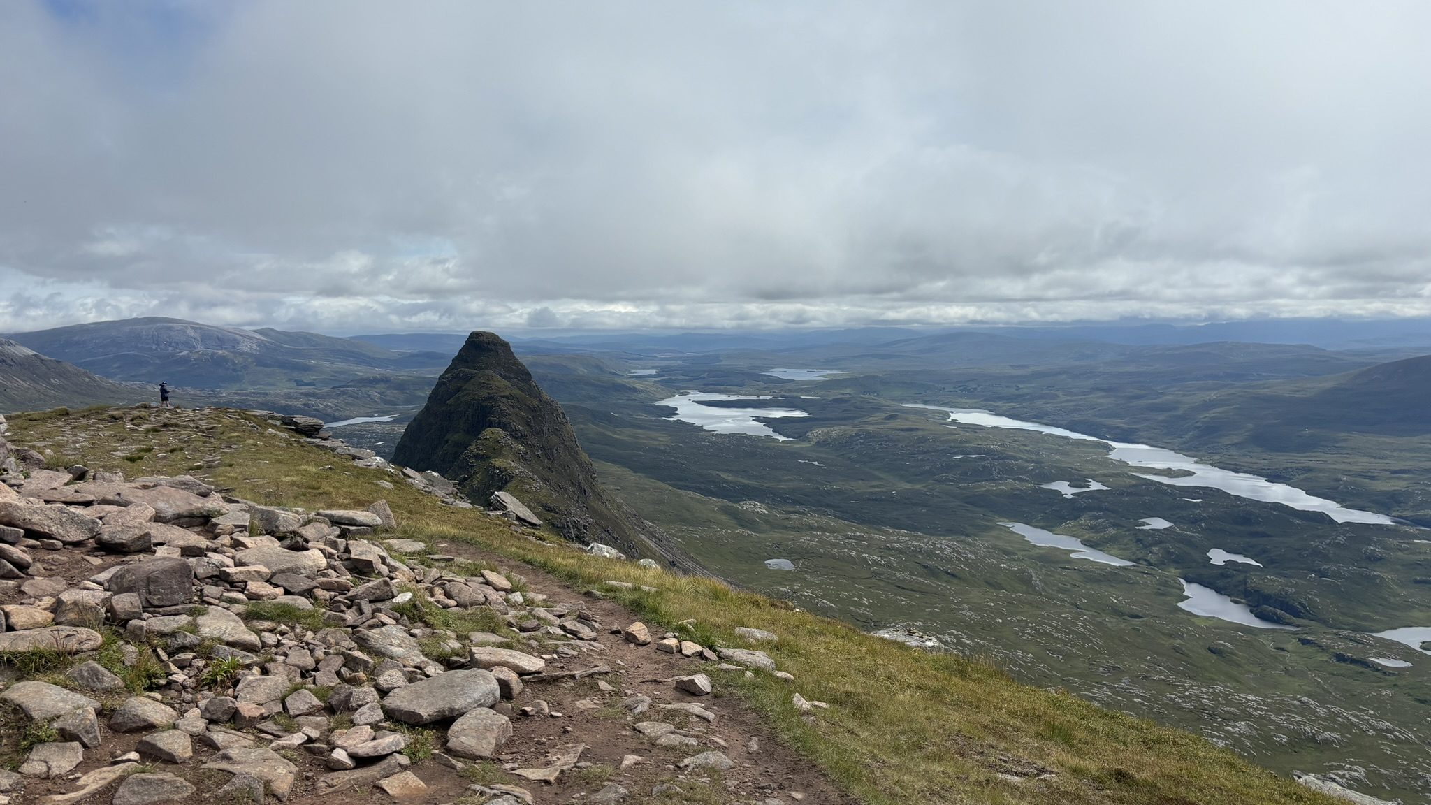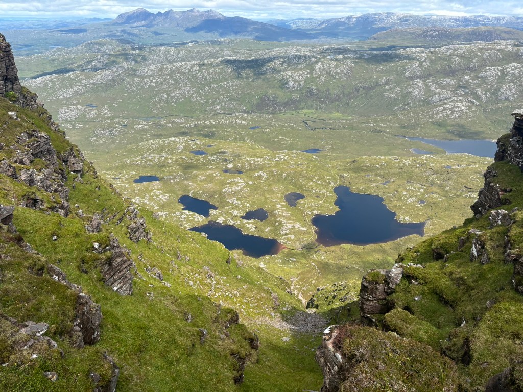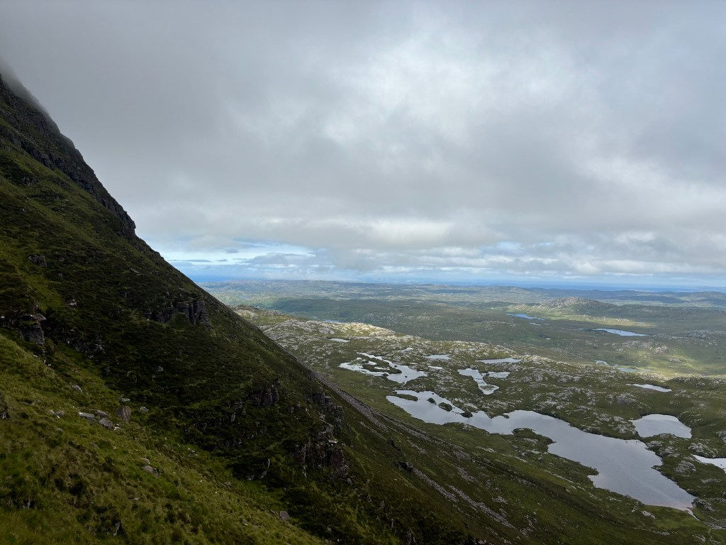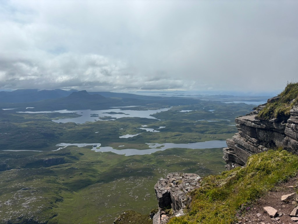I spent another half hour wandering slack-jawed around the summit looking first one way then another as the gaps in the cloud got bigger and eventually I got the full 360 view that the walking websites rave about. I could see why: I am not an expert but in my limited experience most mountains are quite large and bulky so their summits have views mainly of other mountain summits; Suilven however rises up out of the valley on its own so the view is almost as unobstructed as from the top of the Eiffel Tower, and a whole lot more interesting. Sorry Paris but you really are rather flat and rigidly laid out. By design, I know.