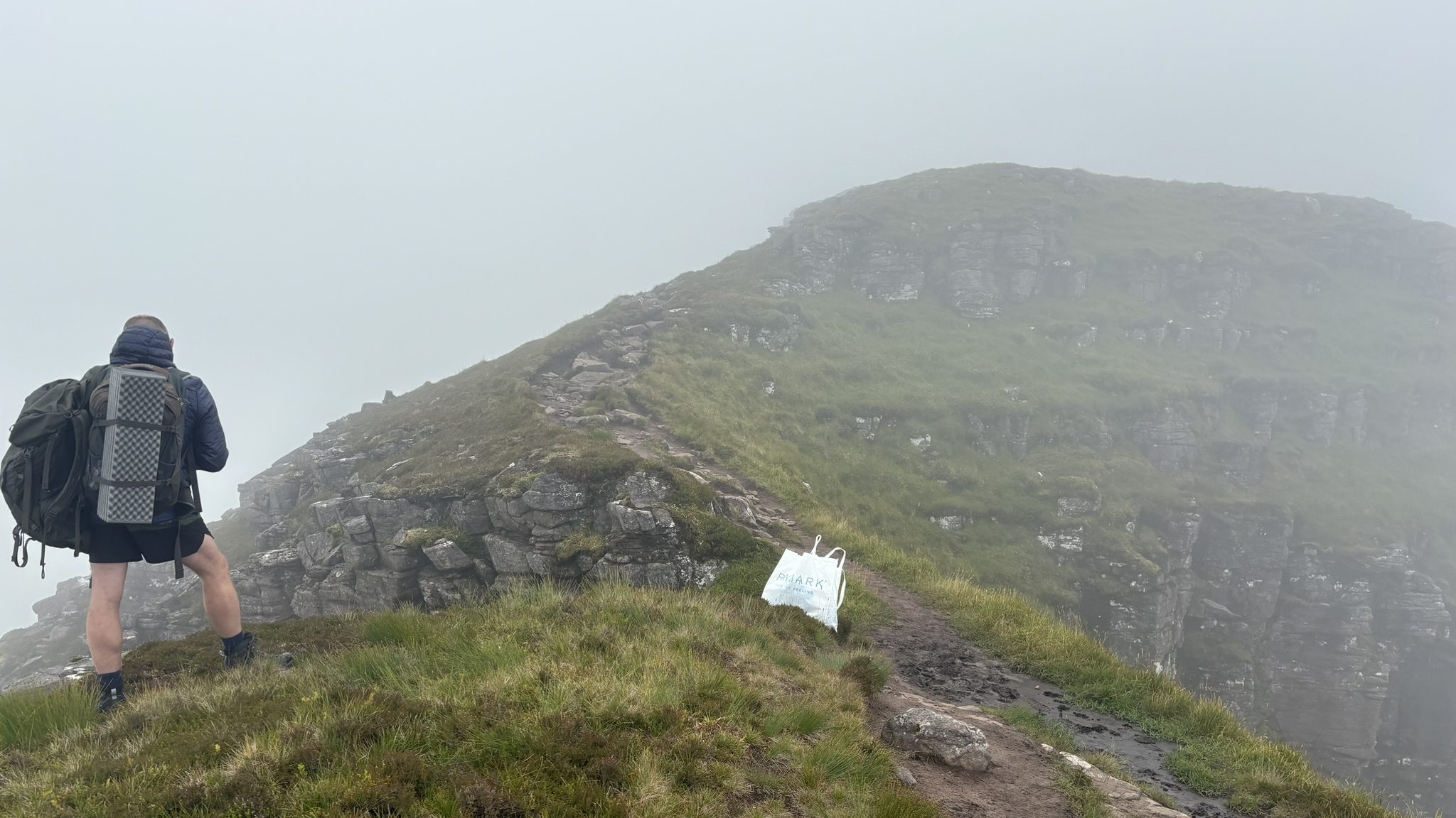 Sure enough this stairway did indeed lead to heaven in the shape of a cold, damp cloud in which the visibility was just enough to show me that if I walked more than a couple of feet off the path on either side I would be back down at the bottom in a matter of moments, but having come this far I was jolly well going to press on to the top, and so I did. This brought two more interesting encounters: I had been following a couple some distance ahead up the gully who appeared to be having a loud argument in what I am fairly sure was Polish. As I neared the summit I met the woman coming down. “I can’t go any further, it’s too steep!” she said as she passed, quite cheerfully. This did seem a bit odd, since she had made it up the longest and steepest gully I had ever climbed, to now chuck it all in on a really quite manageable bit and sit in a cold, damp cloud waiting for her other half. It turned out she waited quite a while, because at the top I came across him carrying, of all things, a large Primark bag.