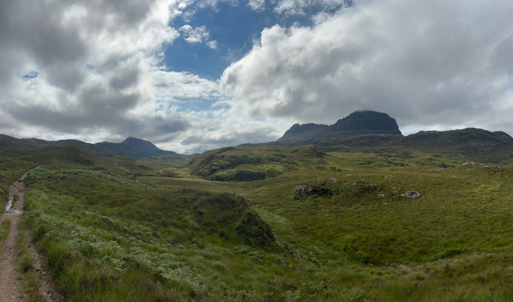 And so to the mountain. I had come up with a plan so cunning that etc etc – I can’t outdo Ben Elton – which minimised the amount of walking involved by cycling as far as I could. I am more of a cruising yachtsman than a proper hill walker (not a high bar in either case). The tiny folding boat bike earned its considerable weight in gold here as it dispatched the three miles to the start of the walk in about ten minutes, although I wondered if I’d be able to walk at all after putting my knees under such inappropriate strain. Leaving it in some trees just past a Victorian shooting lodge in the middle of nowhere, now run as an upmarket lodge-cum-hotel by the Assynt Community Trust, I set off up the very well-made track. I’d done a bit of research (thank you Andrew for pointing me towards the Walk Highlands website where a range of propely Scottish-sounding folk posted in awestruck tones about Suilven – “iconic”, “one of the finest peaks in Britain”) and discovered that the Trust had recently improved the path: so firmly it turns out that it bounced up and down on the bog – a very odd experience but better than squelching through it.