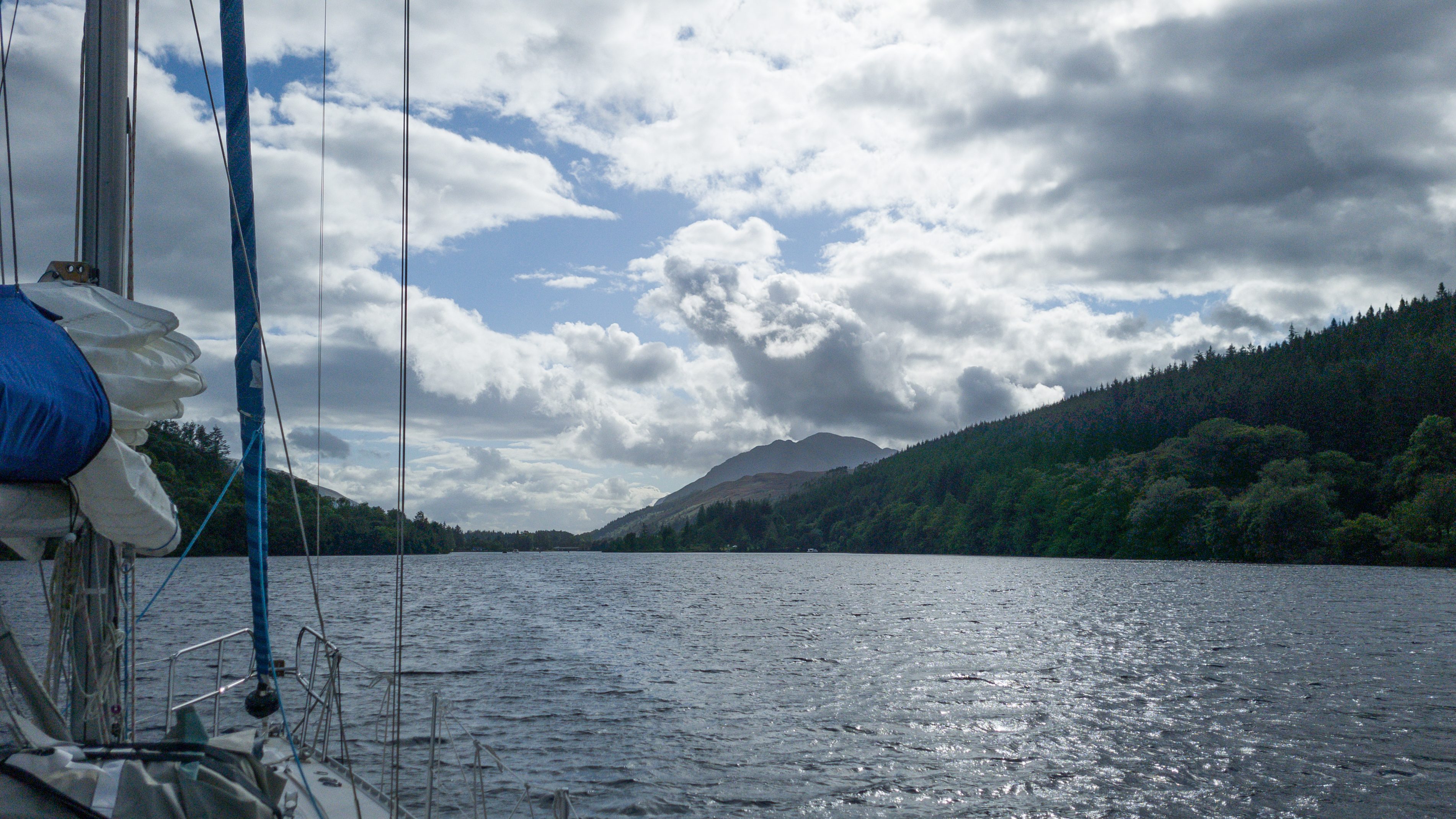 I say ‘sailed’ but it was more or less inevitable that we would motor the whole way, as the Great Glen is cleverly aligned South West so that the prevailing wind can blow straight up it without repetition, hesitation or deviation. We glared jealously at the one or two yachts passing us going north, relaxing with sails out while we bashed into quite substantial waves under engine – most of the time the lochs are less than a mile wide, so beating would have been very slow and rather painful.