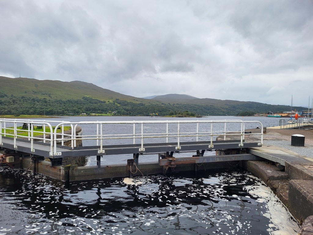 It’s not impossible to go through single-handed (we saw one very competent example, but it involved a lot of complicated ropework and some help from the lock keepers) but it’s a lot easier and more fun with friends, so I was pleased to be joined by Marnie (who was going to come with Sarah until the prop seal incident changed the dates) and Andrew (who benefitted from the changed dates to squeeze the trip into his hectic regatta schedule), and we duly convened on Tuesday afternoon at Muirtown Basin on the edge of Inverness in time to walk down and survey the sea lock at Clachnaharry which I’d come through the day before, sticking out into the mudflats of the Beuly Firth like one of those dams we used to build on the beach when the boys were little. (Actually the real reason was to go to the cosy Clachnaharry Inn, but it was nice for everyone to begin at the beginning, as it were).