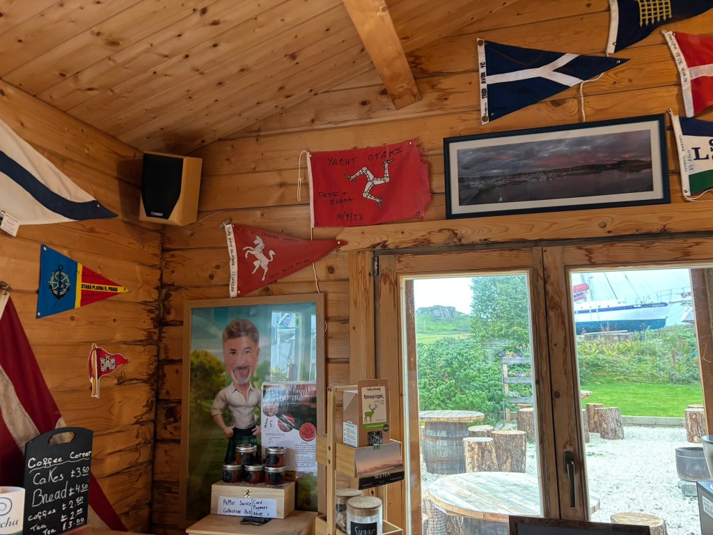 It was worth the motoring though for a grand if short sail next morning down to Kerrera Marina near Oban where we were booked in to have the leaky window finally fixed, the unreliable outboard fettled and the overworked main engine serviced. After ten weeks out in the Far Northwest, North and Northeast this felt like coming home, especially when we went to the bar to find that they had put up the burgee I’d given them: