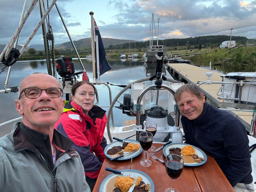 …that we should have been relaxing enjoying; on the other, we were tied up on a very sheltered pontoon long before the gale started howling up the glen. There were no facilities at all up here in the mountains, but we came prepared and ate haggis and neeps in the cockpit in sight of Ben Nevis. Or at least the clouds on it.