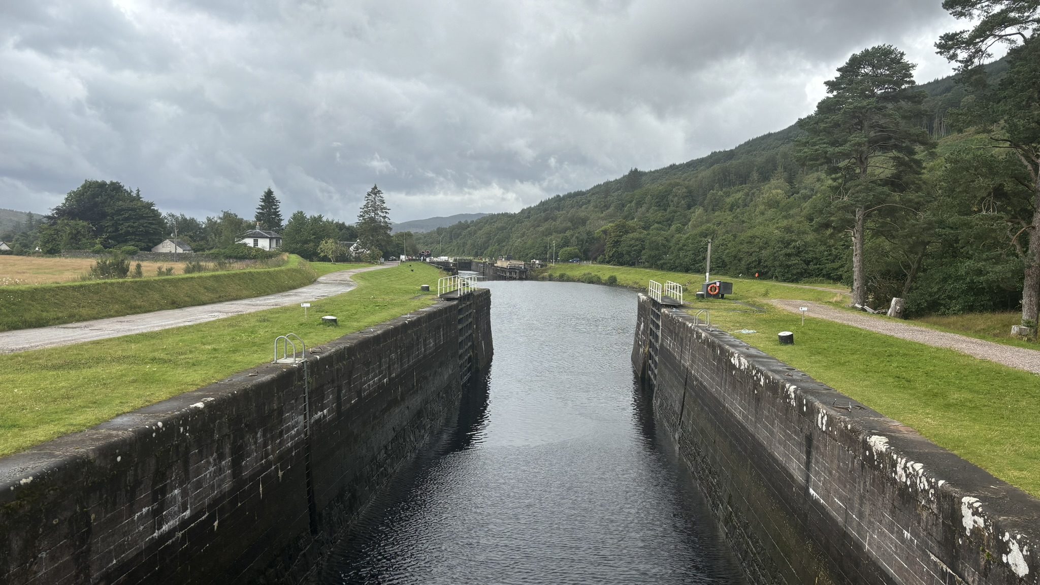 Then our one canal hiccup: the lock keepers are all in contact with each other and we heard the news ripple down the flight of locks: “Barry’s pontoons are full”. Barry, it was explained, was the keeper of the next lock, he was off on his lunch break and the waiting pontoons now had this morning’s queue of boats from Fort Augustus tied onto them, would we mind waiting here? This would kybosh our plans: if we couldn’t get to the locks into Loch Lochy before they closed for the night we would be stuck until the gale arrived. We and the Germans independently formulated the cunning plan of motoring very slowly to arrive at Barry’s lock just as he finished lunch, only to find no boats waiting and Barry himself cheerily heading off for his lunch break. He’d cleared the queue but created an hour’s delay for us.