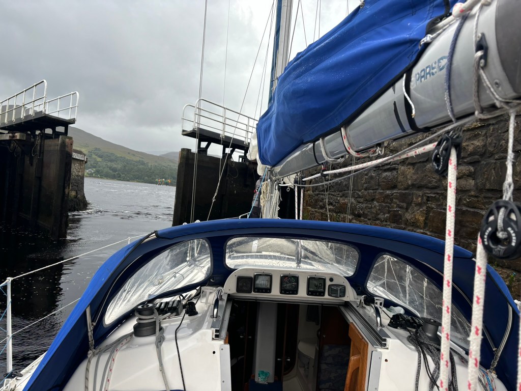 …one more lock and then the sea lock. This was oddly unsettling: after five days of sheltered fresh water it felt very peculiar to be looking at seaweed and listening to the sound of the wind howling in the rigging.