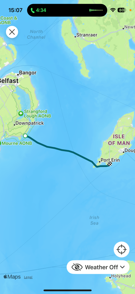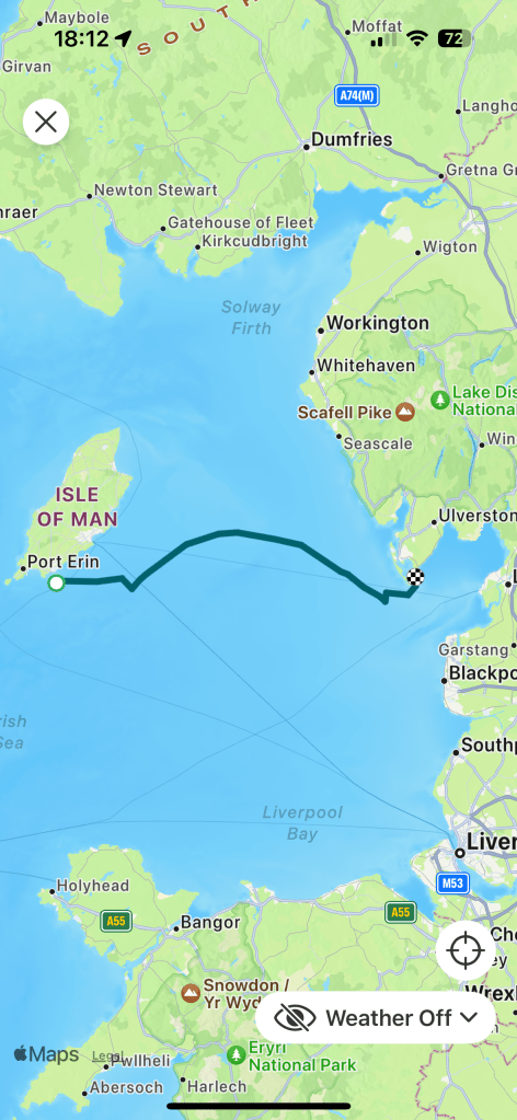 From Castletown to Piel Island is about 48 miles in a straight line, but that corner of the Irish Sea is stuffed with wind farms that you’re not supposed to sail through, so it was going to be over 60 miles and another start in the dark. I had formulated a cunning race-winning strategy however: armed with the certainty of an Irish Sea weather forecast I would sail on starboard tack up the Manx coast to Douglas until the big left-hander arrived, then tack onto the new breeze to lay the top of the windfarms, bear away onto a broad reach down the Cumbrian coast as the wind piped up to the threatened Force 6 and be at Piel well before dark. I sound just like Ben Ainslie on his AC75 microphone, and non-sailors will be impressed by the foreign language.