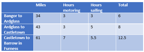 As I’m sure you’ll remember (Ferry(gliding) Cross The Mersey) sailing into Liverpool is at the same time rather wonderful but also something of a dark art. You can only get there around High Water when the tide is slack enough not to get swept past the lock gates, and the nearest places to leave from are so tidal that you can also only leave around High Water, requiring you to spend 12 hours or so at sea, around eight more than you need if you’re coming from somewhere close, say Preston or Fleetwood. It works better if you are coming from somewhere 12 hours away, such as the Isle of Man, but if the tide is at lunchtime then you would need to leave at midnight, which is not much fun if you’re on your own. So I had pencilled in a date a week away when the tide was early afternoon to give me enough time to get there from somewhere that I could leave in daylight, and yet again the only places with no tide restrictions are either North Wales or Piel Island at the entrance to Barrow-in-Furness. I had been there on the way out of Liverpool and in spite of being excited to find the only pub where the landlord is crowned king of his own island (It’s yachting, Jim, but not as we know it), I’d found the pub shut and it all rather bleak, but if the alternative was heading all the way to Wales again then I would have to make do. I was in Bangor, top left on the chart above, which is quite a way from Barrow. On the one hand, it should be three comfortable day sails from Liverpool and I had five days before the tides could be considered civilised; on the other, that meant plenty of time for the wind to make a complete nuisance of itself by changing its mind and either blowing from the wrong direction or not at all.