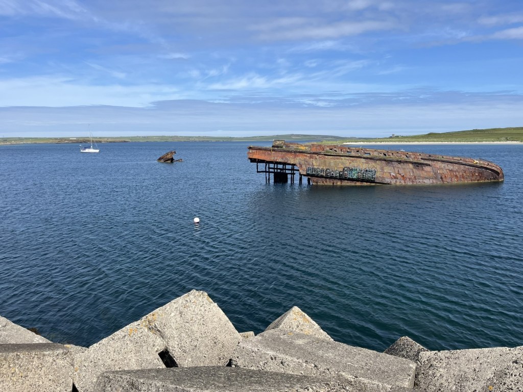 Two more days of gales and driving rain meant that we had to look further afield for entertainment. On one day we split: Tim to acquaint himself with most of Orkney’s bus routes by visiting the neolithic attractions I’d visited before by bike, and me to do a range of boat and domestic tasks including a trip to the barber’s and the laundry. On the other day we played a blinder by spotting an indoor activity in the form of the Scapa Flow Museum. We’d hoped to sail into Scapa Flow to visit it but in a gale this would have brought with it the possibility of adding another wreck to its already famous collection, so we left the boat and took a bus and a ferry. This was in itself challenging in such wind and rain, but the wettest we got was between the boat and the bus stop. The museum was excellent, covering its role in both World Wars, the scuttling of the German fleet in WW1, the sinking of the Royal Oak by a U-boat and the subsequent building of the Churchill Barriers in WW2, along with much else.