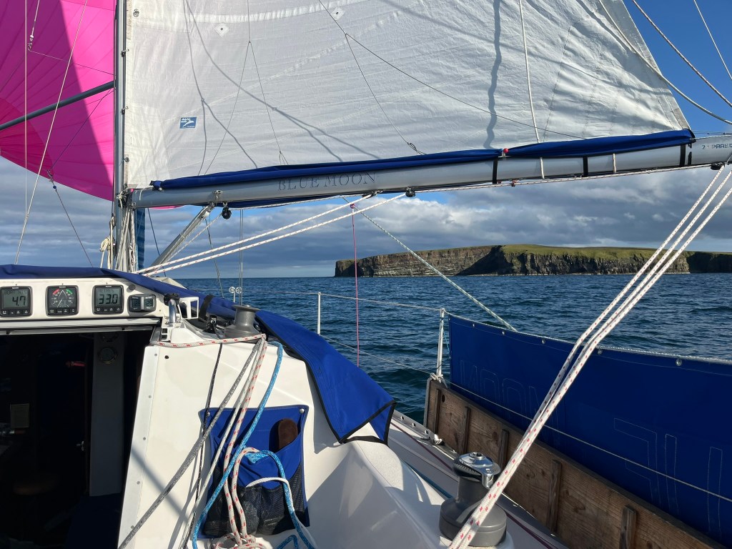 Finally the wind died down and the sun came out, so we left Kirkwall straight away and enjoyed our only light wind/downwind leg of the trip. We managed to get the tide mainly right, gybed inside some Poles (Eastern Europeans, not navigation marks), carried the spinnaker to the Pass of Copinsay and headed up into East Weddell Sound off one of the Churchill barriers in time for supper on board.