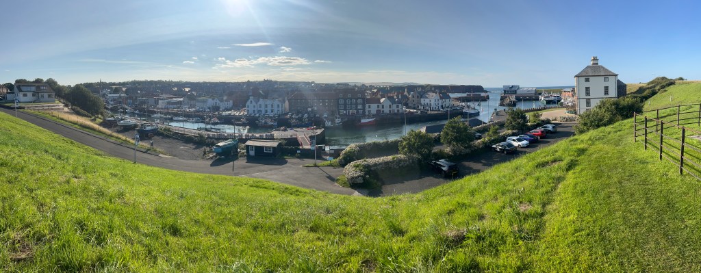 I’d spent a day stormbound – literally, as Storm Floris had Blue Moon pinned to the side of the pilot boat, and even in the sheltered Tweed Dock we recorded gusts of 46 knots. The harbour guys kindly came down to check I was OK and lent me their biggest fender, so I thought it was unseamanlike just to push off and go sightseeing. So when the following day turned out to be just plain very windy rather than an actual storm, I got on the bus to St Abbs (the village doesn’t have an apostrophe) and hiked around the lighthouse and the headland (which does), back along the coast path through Eyemouth to the picture postcard village of Burnmouth which is, reassuringly, at the mouth of a burn but one that looks more like a canyon as the train hurtles over the top.