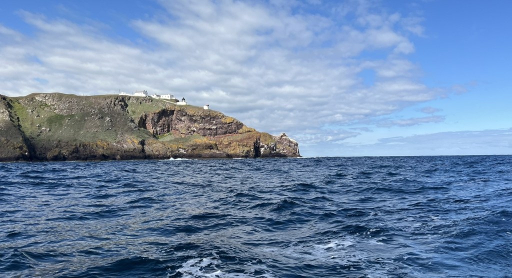 The early start made for a couple of hours leisurely motoring in a flat calm which took me past St Abb’s Head, which should really be the border as it’s where the coast of the Firth of Forth turns south and heads down to England. But it isn’t, and a few miles further south is the most Scottish fishing town in the shape of Eyemouth, which I’d barely heard of, it not being visible through the train window. The whole area was full of stunning cliffs with seabirds wheeling around, and in the calm I managed to motor close enough to decide that since Storm Floris was booked to spoil my sailing in a couple of a days time, these cliffs would do for the full land-based storm experience.