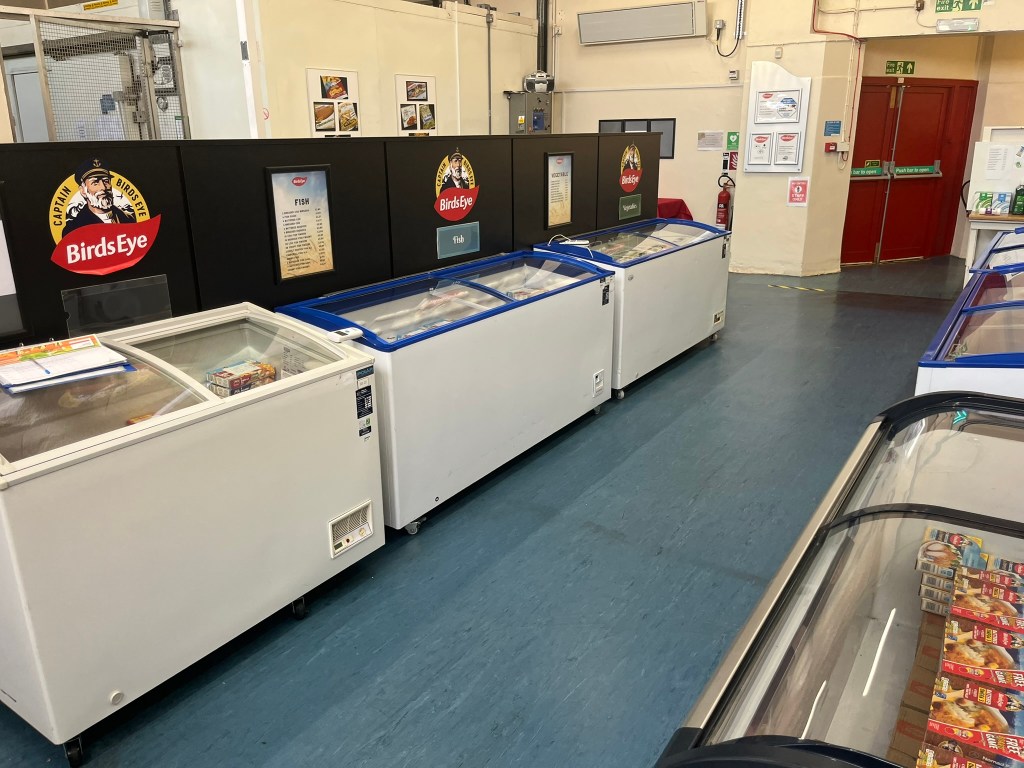 To our intense disappointment, the interior made Booker look like Harrods, and there was no sign of The Captain beyond some cut-outs. Just a small collection of chest freezers containg frozen peas and chicken nuggets, and a woman wearing a blue hair net to prove it was a factory, who, sensing potential customers, instantly hid behind a freezer.