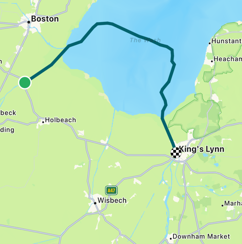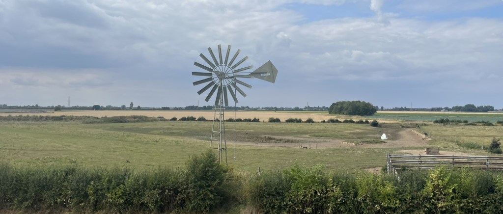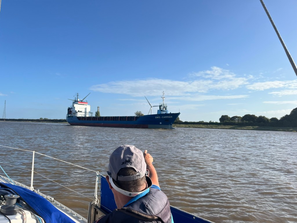 Luckily the weather sort of played ball. It only rained for about an hour, and mainly the sun shone, and mainly the wind was quite helpful. We had another of those ‘green to green’ conversations with a coaster on the way out of Kings Lynn: