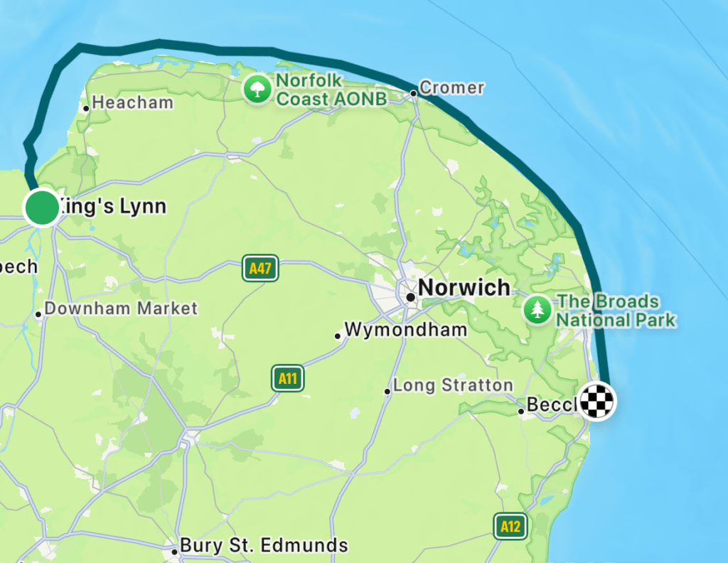 Eager readers will also notice the presence, to the left of Cromer, of something which could perhaps be called a cliff. To my surprise these continued for a few hours, putting paid to my earlier assertion that there weren’t any between Flamborough and Ramsgate. If there are awards for geographical education, the blog is in line for a few more.